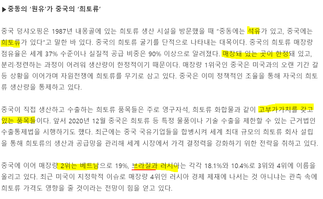하지만, 반도체에 필수적인 희토류를 자국 기술로 진행하기 위해, 중국 의존도를 줄이기 위해 자국의 기업을 발전 시킬 가능성이 매우 높다.