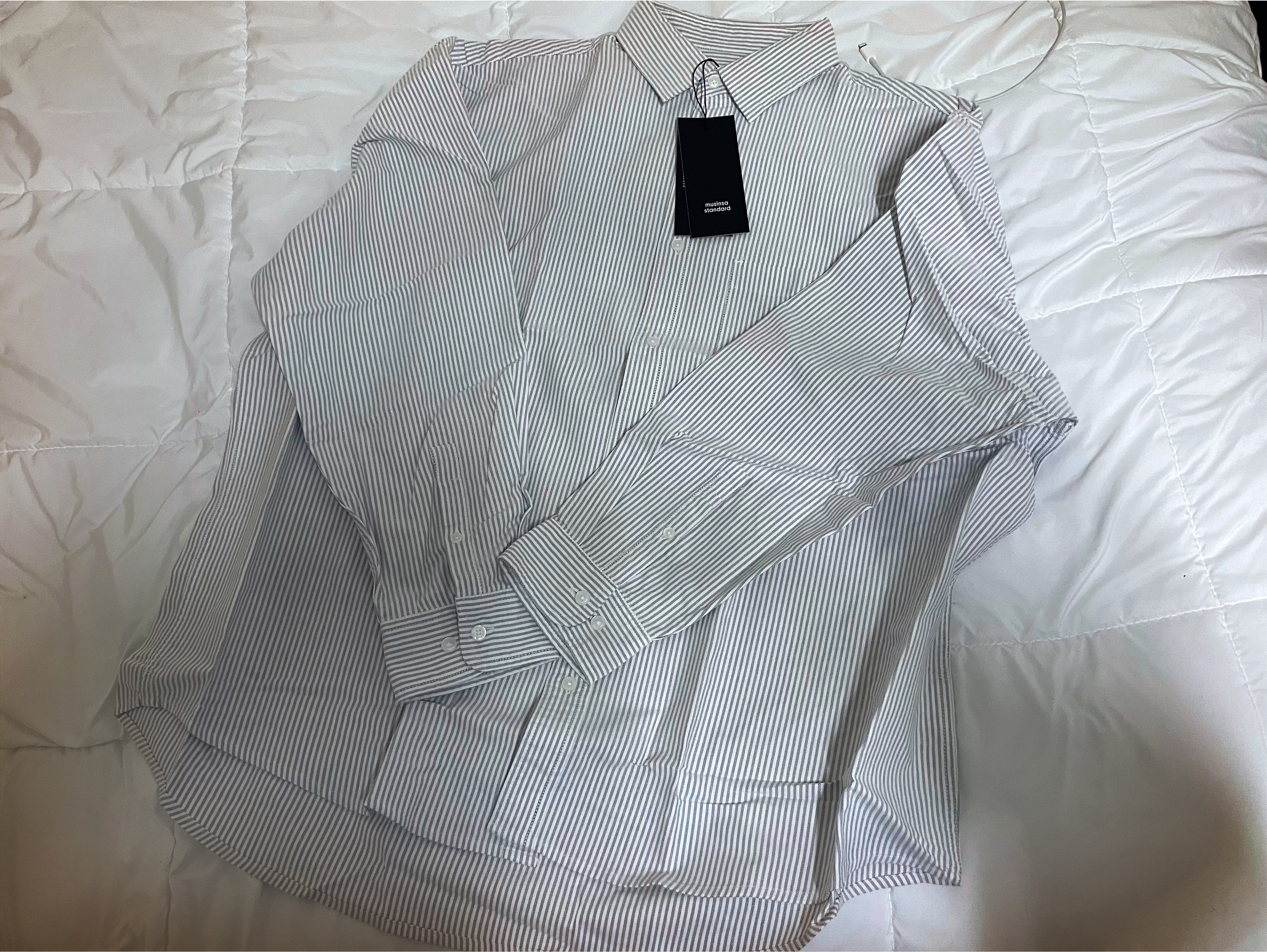 무신사 스트라이프 오버사이즈 옥스포드 셔츠 [그레이 스트라이프]