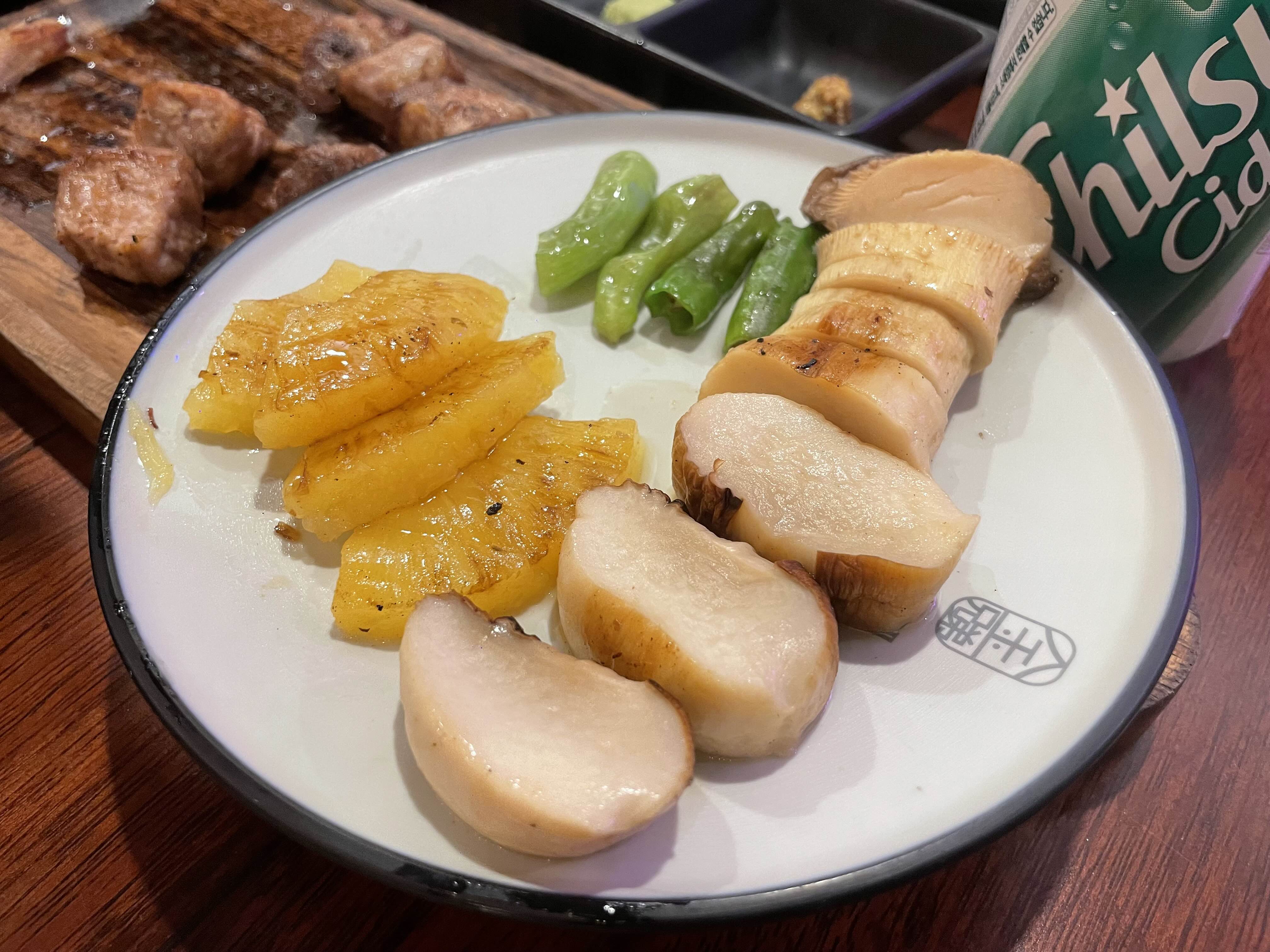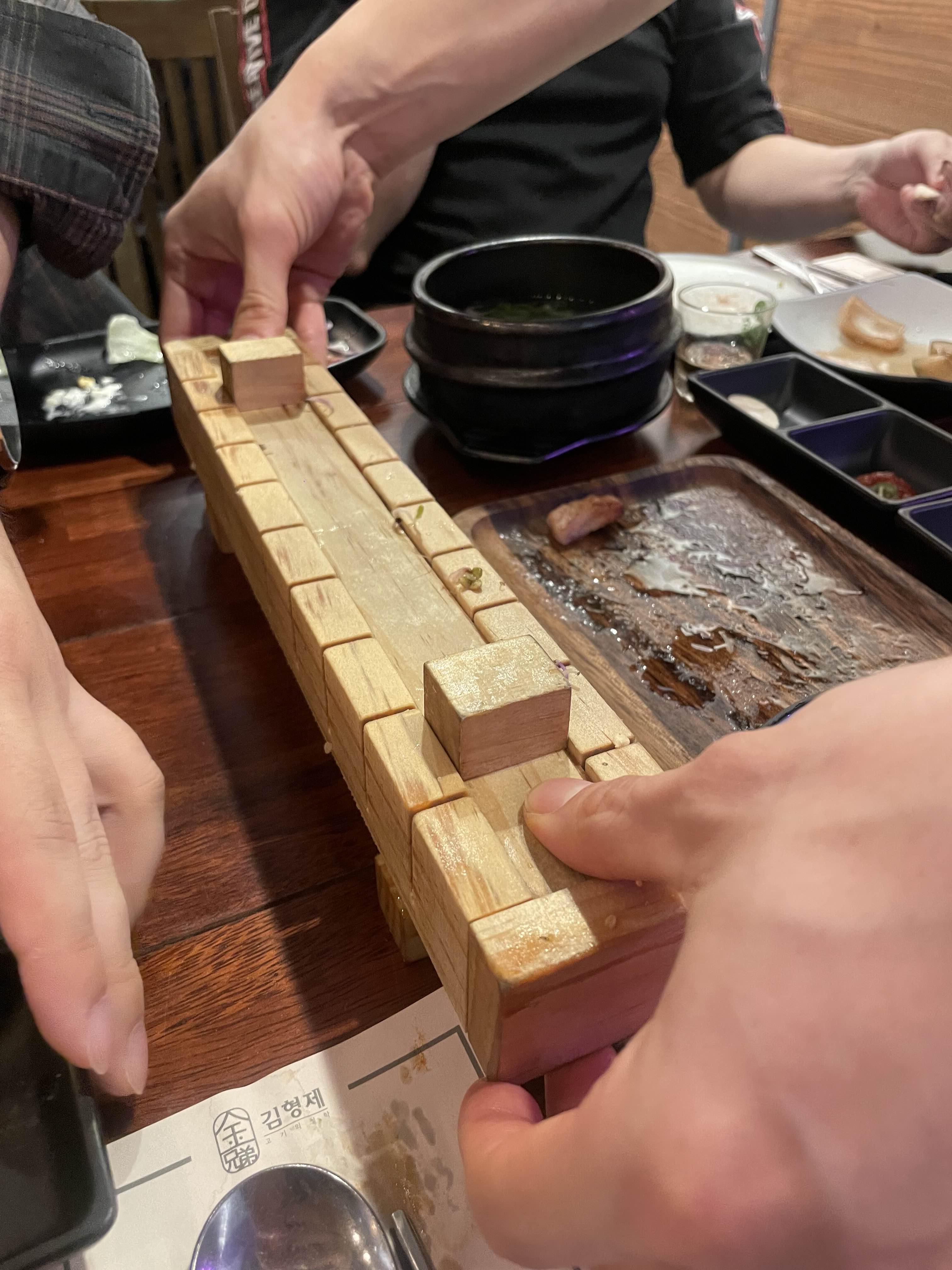 나무 쟁반에 고기를 차곡차곡 쌓아서 전달해 줘요
